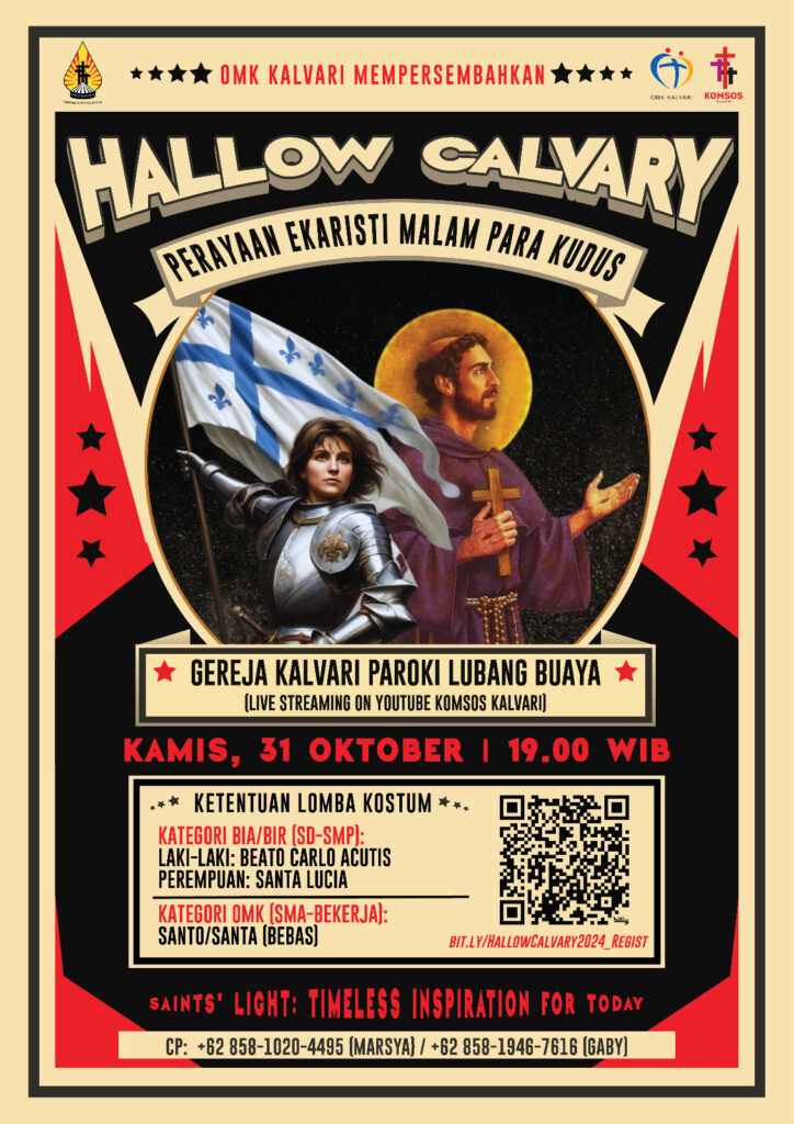 Gereja Katolik memiliki tradisi yang kaya dalam merayakan kehidupan para kudus yang telah mendahului kita. Para kudus ini adalah teladan iman, pengharapan, dan kasih yang memperlihatkan bagaimana hidup di dalam Kristus. Dalam rangka memperingati Malam Para Kudus, Gereja Kalvari Paroki Lubang Buaya dengan sukacita mengundang seluruh umat untuk mengikuti Misa Perayaan Ekaristi bertema “Hallow Calvary”. Acara ini akan diisi dengan berbagai kegiatan menarik, termasuk lomba kostum yang bertujuan untuk memperkuat kebersamaan dan memperdalam iman kita.