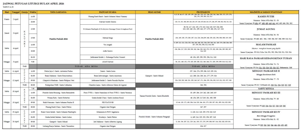 Berikut adalah jadwal petugas Liturgi bulan April 2026, harap petugas dapat mempersiapkan diri dengan baik.