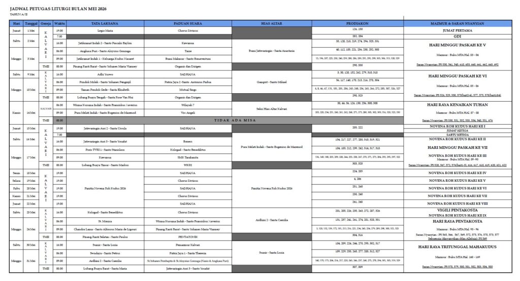 Berikut adalah jadwal petugas Liturgi bulan Mei 2026, harap petugas dapat mempersiapkan diri dengan baik.