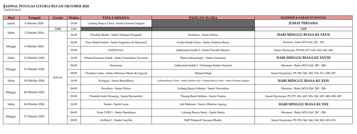 Home » Bekal » Jadwal Petugas Liturgi Paroki Lubang Buaya – Kalvari Oktober – November 2024 Jadwal Petugas Liturgi Paroki Lubang Buaya – Kalvari Oktober – November 2024 Admin Kalvari October 1, 2024 Jadwal Petugas Liturgi Bulan Oktober 2024 Jadwal Petugas Liturgi Okt 2024Download Jadwal Petugas Liturgi November 2024 Jadwal Petugas Liturgi Nov 2024Download