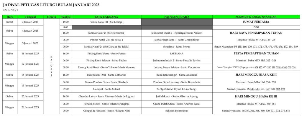Home » Bekal » Jadwal Petugas Liturgu Bulan Januari 2025 Jadwal Petugas Liturgu Bulan Januari 2025 Admin Kalvari December 4, 2024 November 10, 2025 Silahkan di download pada link berikut Jadwal Petugas Liturgi Jan 25 – rev1Download