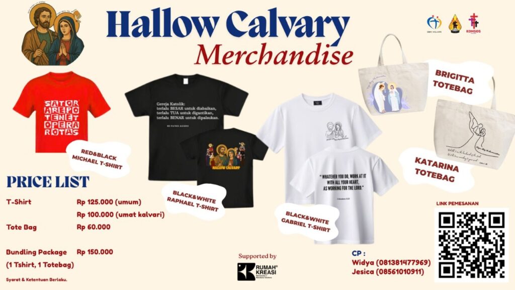 • Dalam rangka pencarian dana acara Hallow Calvary, OMK Kalvari membuka Pre-order Kaos dan totebag. Pemesanan kaos dan totebag dapat melalui link Scan Barcode
