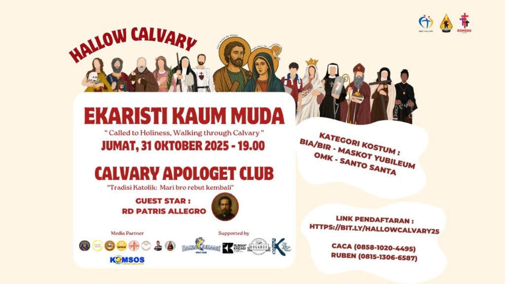 •OMK Kalvari mengundang seluruh kaum muda untuk hadir dalam Hallow Calvary 2025 – Pesta Malam Para Kudus dengan tema “Called to Holiness, Walking through Calvary”. Acara diawali dengan Ekaristi Kaum Muda pada Jumat, 31 Oktober 2025 pukul 7 malam di Gereja Kalvari, Lubang Buaya.