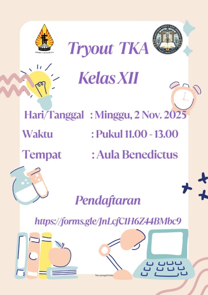 PAPEDIK Kalvari mengadakan tryout bagi siswa/i kelas XII yang akan diselenggarakan pada hari Minggu, 2 November 2025, pukul 11 siang, di Aula Benedictus. Pendaftaran peserta melalui link yang tertera pada layar atau dapat menghubungi Kak Yustine
