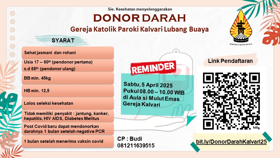 Seksi Kesehatan Gereja Kalvari kembali mengadakan kegiatan Donor Darah yang akan diadakan pada hari Sabtu, 5 April 2025, pukul 08.00 – 10.00, di Aula Si Mulut Emas.