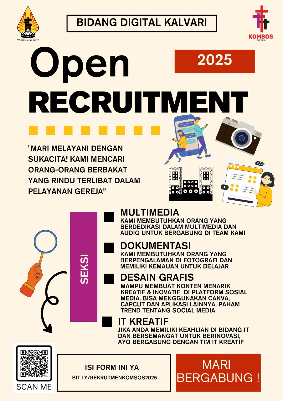 Membuka kesempatan bagi seluruh umat untuk bergabung dan melayani di bidang komunikasi sosial. Pendaftaran dibuka mulai tanggal 22 Maret s/d 6 April 2025. Pendaftaran melalui link. https://bit.ly/Rekrutmenkomsos2025