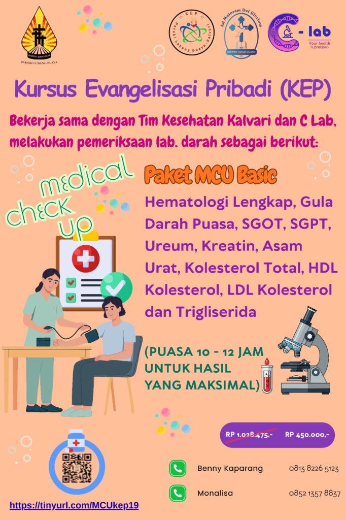KEP bekerjasama dengan Tim Kesehatan & C Lab melakukan pemeriksaan Lab darah . Bagi umat yang berminat silahkan menghubungi Benny Kaparang dan Monalisa.