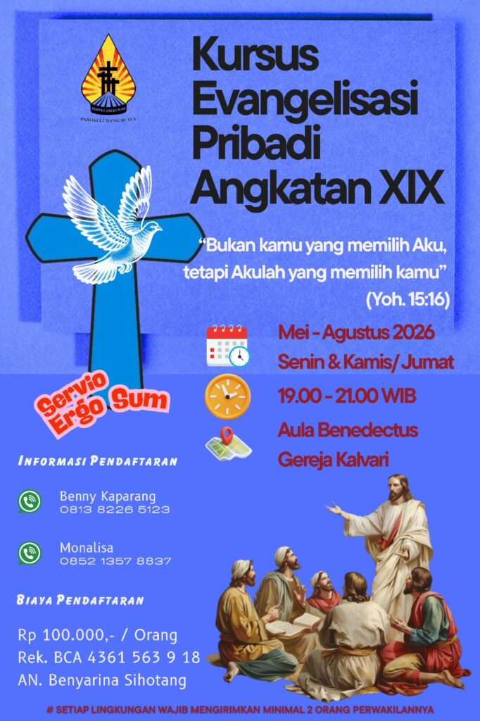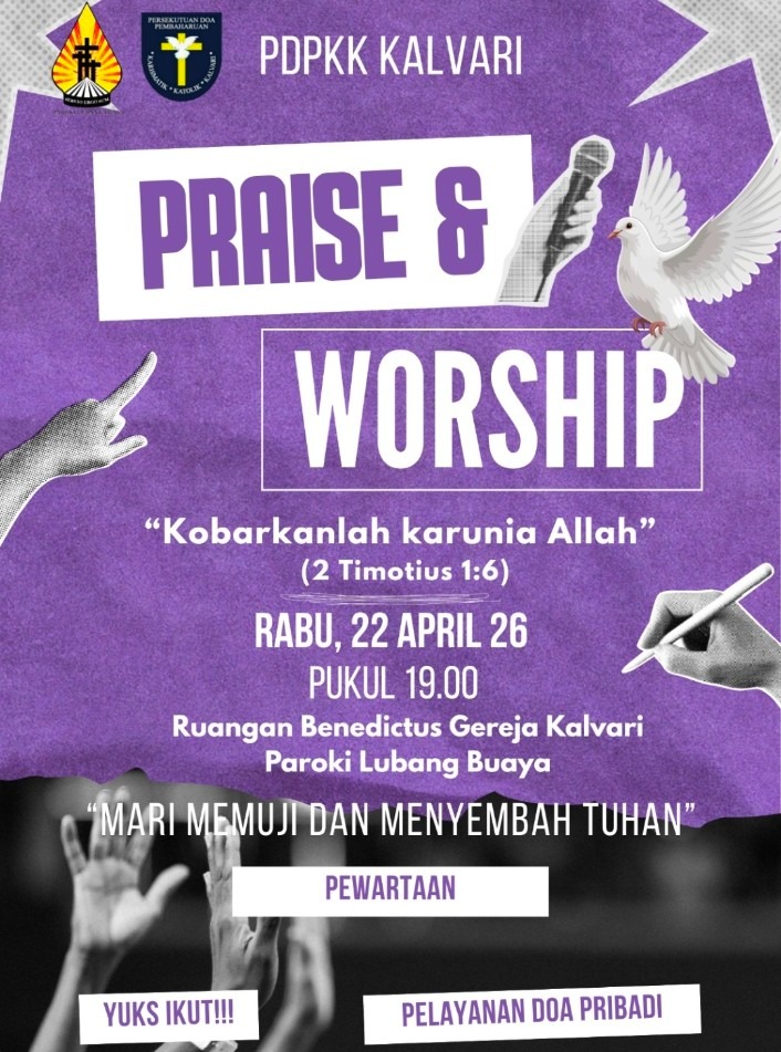 Praise & Worship PDPKK Kalvari dengan tema “Kobarkanlah Karunia Allah” diadakan pada hari Rabu 22 April 2026, pukul 7 malam, di Ruang Benediktus.