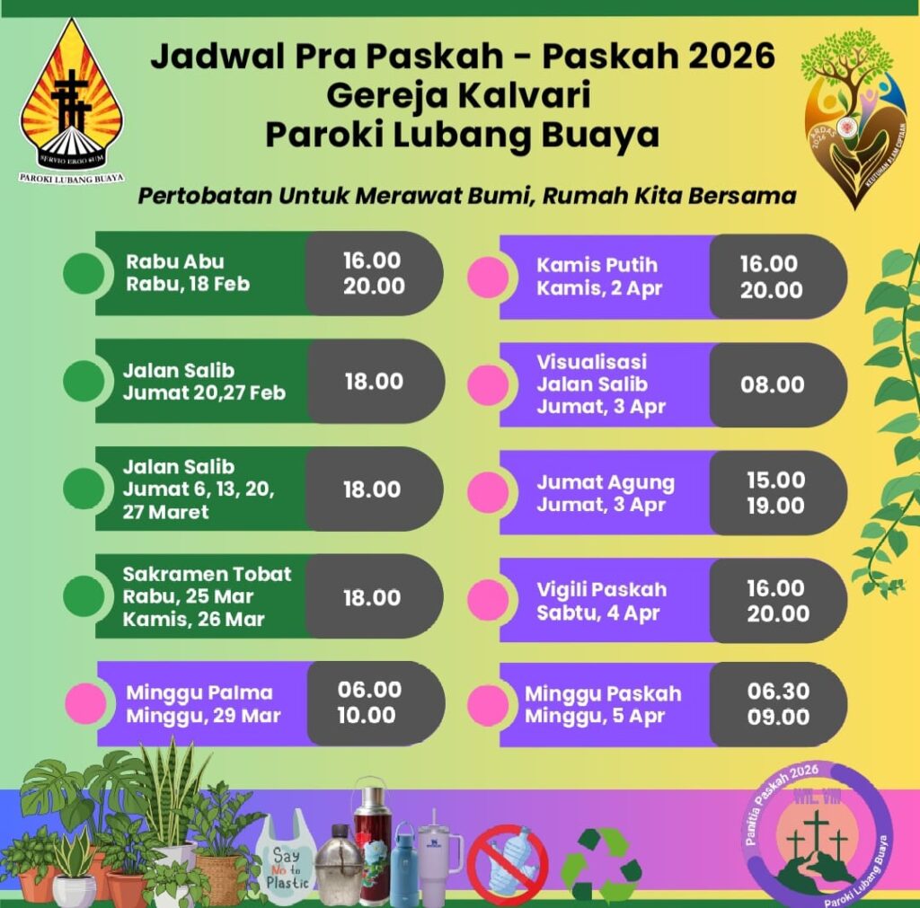 • Jalan Salib diadakan pada hari Jumat, 06 Maret 2026, pukul 6 sore di Taman Doa Kalvari, dilanjutkan dengan Perayaan Ekaristi Jumat Pertama di Gereja Kalvari.