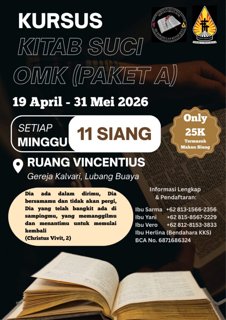 Diadakan pada setiap hari Minggu, mulai tanggal 19 April s/d 31 Mei 2026 ( 7 kali pertemuan ), pukul 11 s/d setengah 2 siang, di Aula Vincentius. Biaya pendaftaran sebesar Rp. 25.000,- (sudah termasuk makan siang – pembayaran pendaftaran ditransfer ke