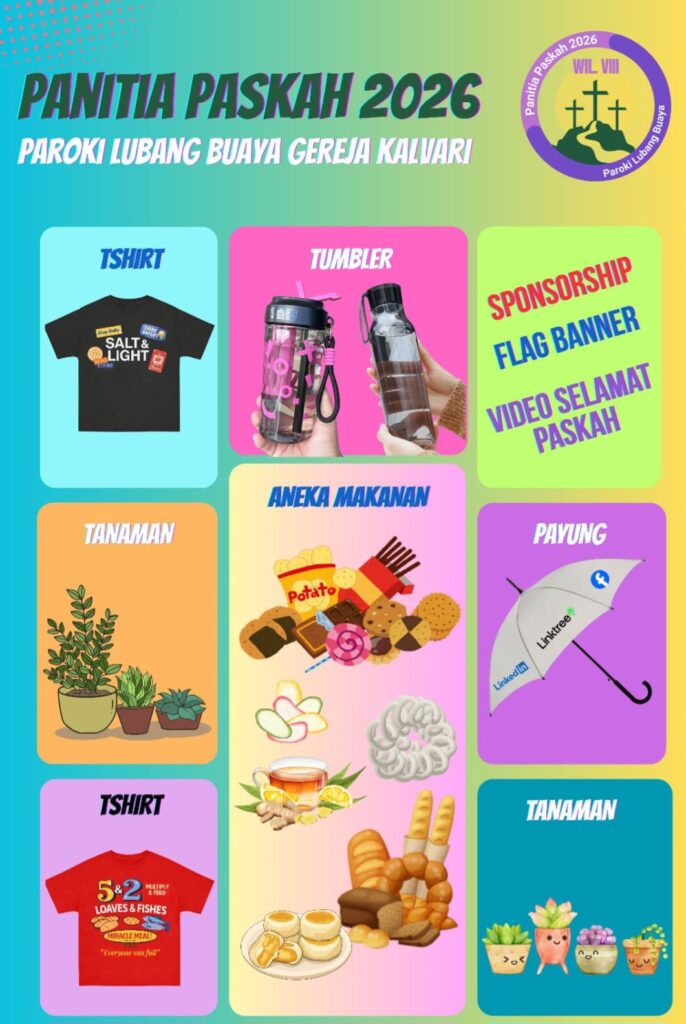 • Panitia Paskah menyediakan cemilan sehat dan minuman gratis untuk umat sepulang misa setiap hari Minggu. Bagi umat yang ingin mengambil minuman diharapkan memakai tumbler masing2, tidak diperkenankan memakai botol plastik bekas air mineral