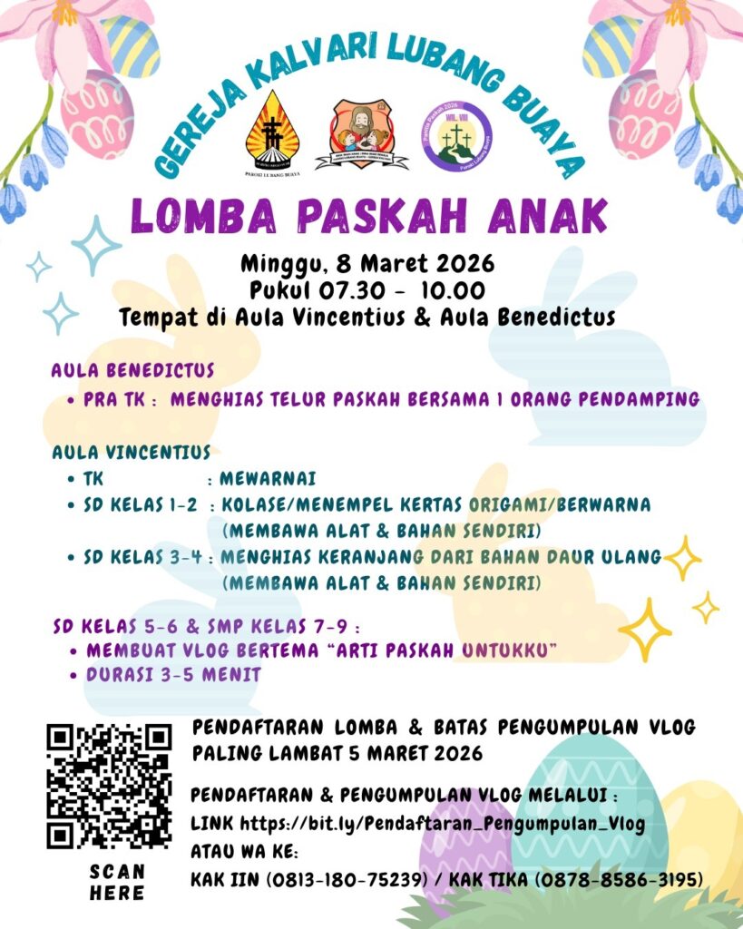 • Panitia Paskah & Seksi Bina Iman Anak mengadakan Lomba Paskah Anak yang akan diadakan pada hari Minggu, 8 Maret 2026, pukul setengah 8 pagi s/d 10 pagi, di Aula Vincentius. Pendaftaran Lomba & Pengumpulan Vlog paling lambat pada tanggal 5 Maret 2026. Pendaftaran melalui link yang tertera pada layar atau dapat scan