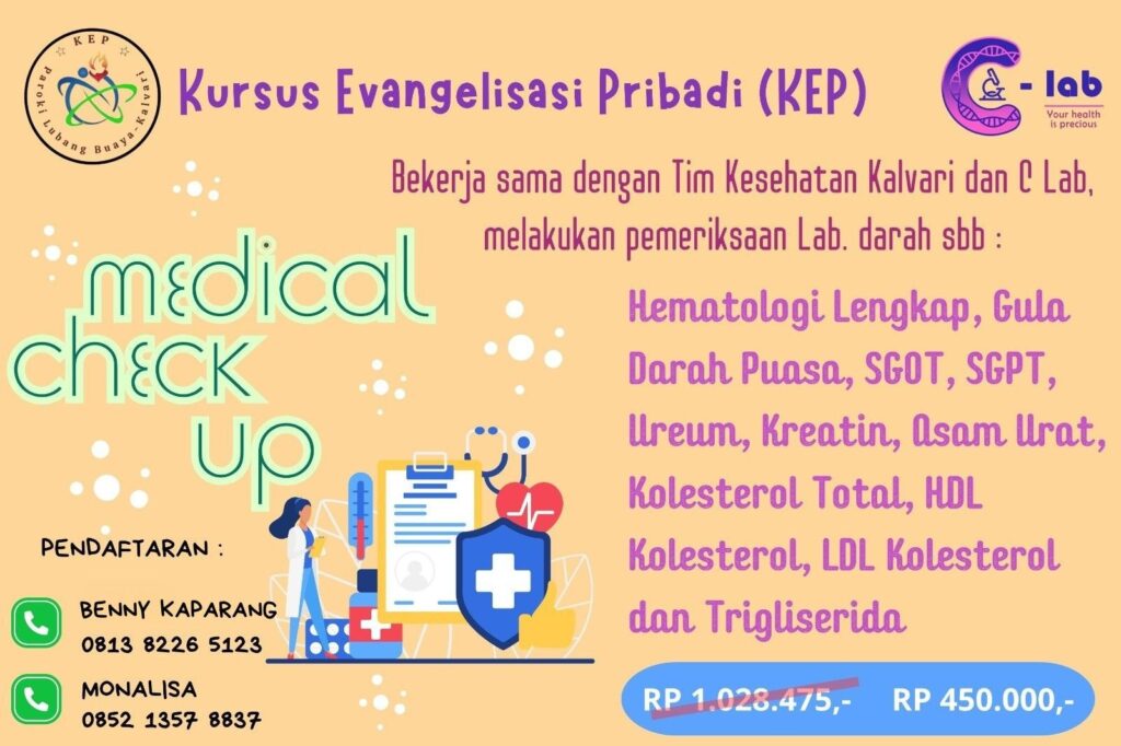 •KEP Angkatan 19 bekerjasama dengan Tim kesehatan & C Lab melakukan pemeriksaan Lab darah. Bagi umat yang berminat dapat menghubungi Bapak Benny Kaparang / Ibu Monalisa.