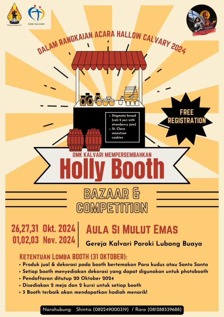Bagi Calvarian & para penggiat UMUK, kami mengundang untuk bergabung & membuka booth pada Holly Booth, sebuah acara spesial bagi para pelaku UMKM yang akan berlangsung pada tanggal 26, 27 & 31 Oktober, dan 01,02, & 03 November 2024 di Aula Si Mulut Emas, Gereja Kalvari.