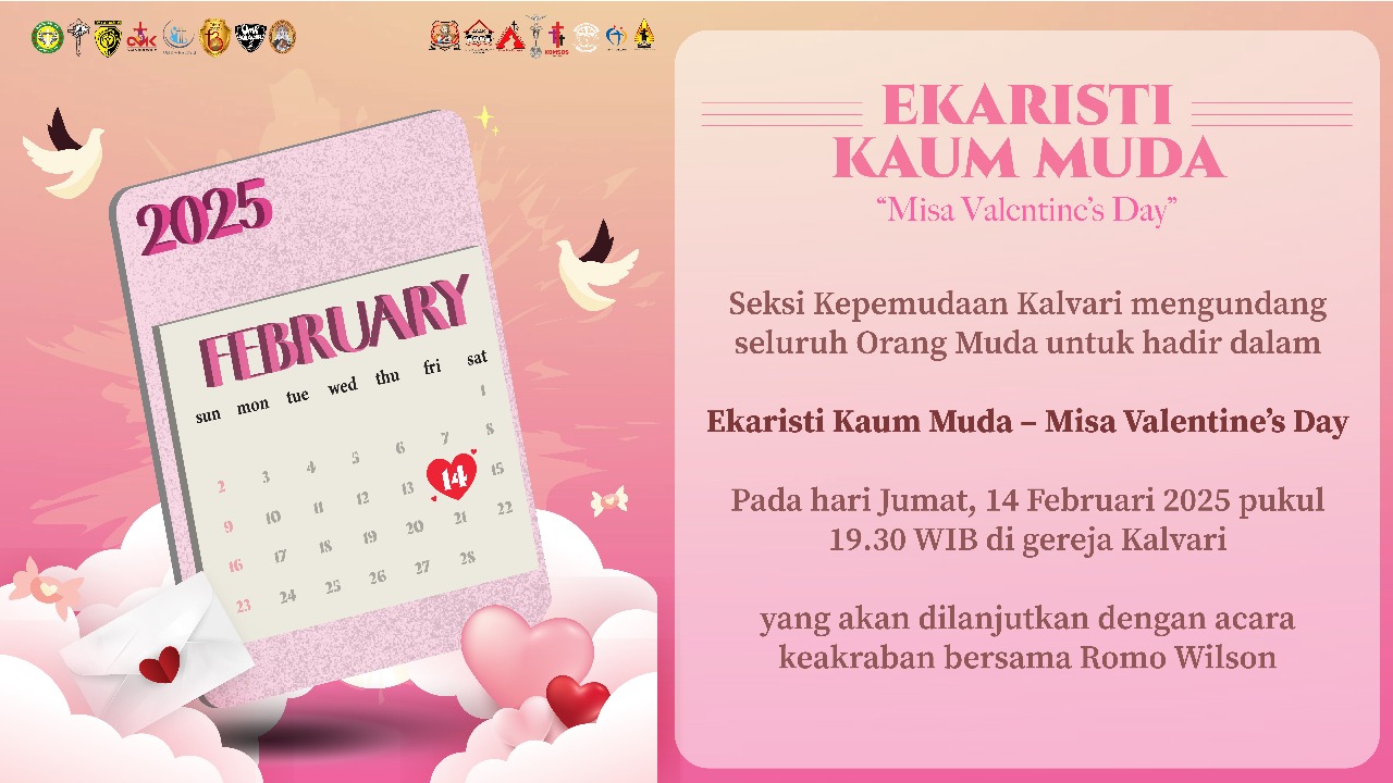 Seksi Kepemudaan Kalvari mengundang seluruh Orang Muda untuk hadir dalam Ekaristi Kaum Muda – Misa Valentine’s Day yang akan diadakan pada hari Jumat, 14 Februari 2025 pukul 19.30 WIB di Gereja Kalvari. Setelah misa akan dilanjutkan dengan acara keakraban bersama Romo Wilson.
