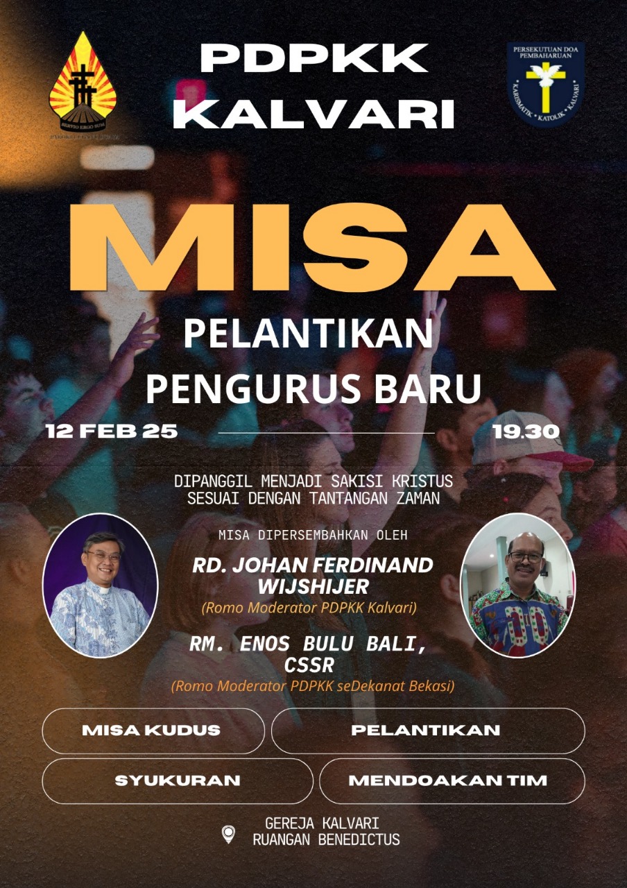 Mengundang saudara/i semua untuk hadir pada Misa Pelantikan Pengurus Baru PDPKK yang diadakan pada hari Rabu, 12 Februari 2025, pukul 19.30 di Ruang Benediktus.