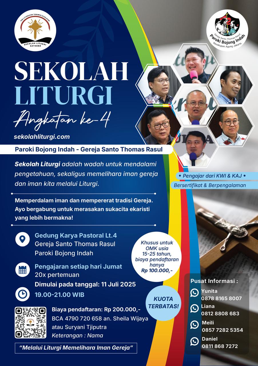 Diadakan mulai 11 Juli 2025, di Gedung Karya Pastoral lt. 4, Paroki Bojong Indah. Pengajaran pada setiap hari Jumat, pukul 19.00 s/d 21.00 ( 20x pertemuan). Biaya Pendaftaran Rp. 200.000,-. Info lebih lanjut dapat menghubungi Sekretariat.