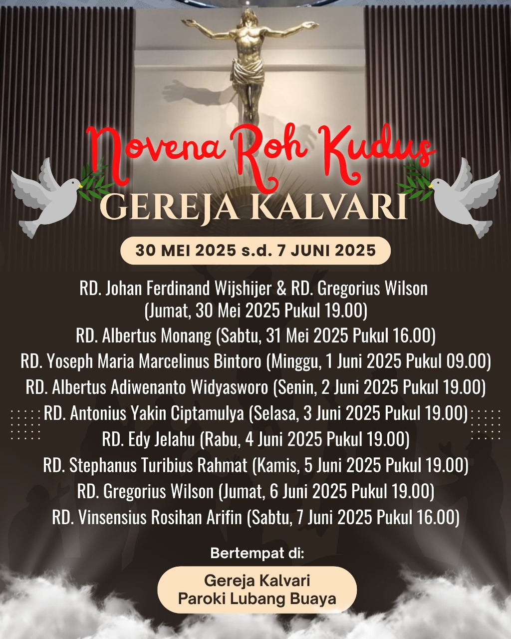 Diadakan mulai hari Jumat, 30 Mei s/d 07 Juni 2025, pukul 19.00, di Gereja Kalvari, kecuali hari Sabtu & Minggu (dilaksanakan bersamaan dengan Misa Sabtu sore & Misa Minggu Pagi pukul 09.00). Umat dapat mengisi intensi permohonan doa di depan gereja sebelum misa dimulai untuk didoakan pada saat Doa Umat.