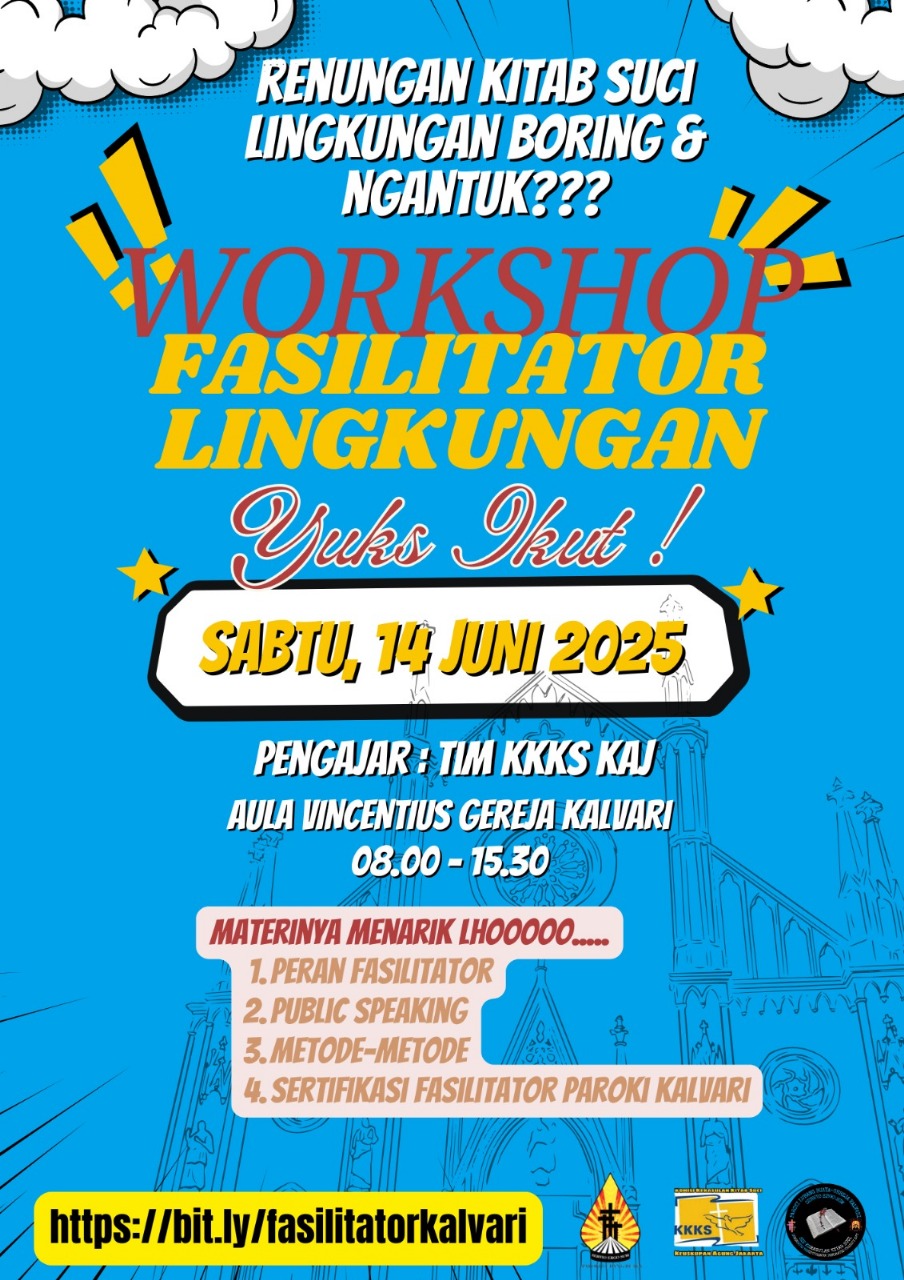 Mengundang Para Fasilitator / Pemandu Kitab Suci / Pendalaman Iman Lingkungan dan OMK untuk menghadiri Workshop Fasilitator Lingkungan dan OMK dengan narasumber / pengajar dari Komisi Kerasulan Kitab Suci KAJ yang akan dilaksanakan pada hari Sabtu, 14 Juni 2025, pukul 08.00 – 15.30 WIB, di Aula Vincentius.