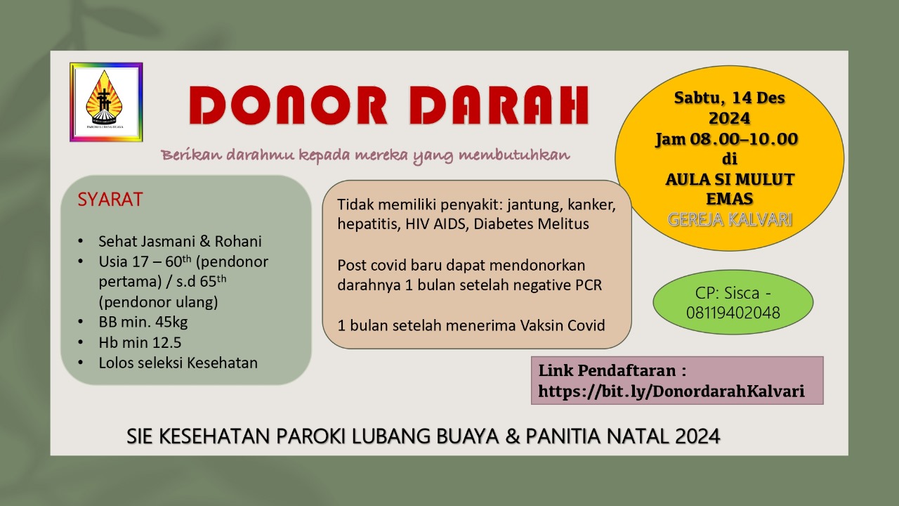 Sie Kesehatan bekerjasama dengan Panitia Natal & PMI mengadakan kegiatan DONOR DARAH yang akan diadakan pada hari Sabtu, 14 Desember 2024, pukul 08.00 – 10.00, di Aula Sang Mulut Emas. Pendaftaran melalui link yang sudah dibagikan kepada para ketua lingkungan masing-masing.